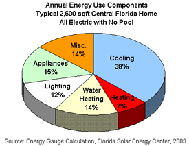 In Florida, air conditioning energy use makes up about 40% of total energy use (see pie chart), making it the primary target for energy saving strategies. And the most threatening health risks revolve around high indoor humidity (which contributes to mold growth) and indoor pollutants.
