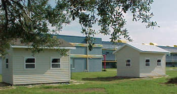 The importance of ceiling heat flux has long been recognized, with insulation a proven means of controlling excessive gains. However when ducts are present in the attic, the magnitude of heat gain to the thermal distribution system can be much greater than the ceiling heat flux. This influence may be exacerbated by the location of the air handler within the attic space - a common practice in much of the southern US. Typically an air handler is poorly insulated and has the greatest temperature difference at the evaporator of any location in the cooling system. It also has the greatest negative pressure just before the fan so that some leakage into the unit is inevitable. The Flexible Roof Facility (FRF) is an FSEC test facility designed to evaluate five roofing systems at a time against a control roof with black shingles and vented attic (Figure 101). The testing evaluates how roofing systems impact summer residential cooling energy use and peak demand. Final Year Experiments The summer of 2005 featured the final reconfiguration of the test cells (Table 67) in FSEC’s Flexible Roof Facility (FRF). Test Cell #6 remained a white metal standing seam roof (best performer so far). Research will collect data on varied ventilation rates for FRF testing 2005 – a gap within the FSEC and roofing industry related research which is important to address. Instrumentation will obtain plywood decking moisture and attic moisture measurements as part of the protocol. All test cells were altered to R-30 insulation installed on the attic floor with the ventilation areas carefully verified by blower door pressurization. All test cells, except test cell #6, now have black shingle roofs. Relative humidity sensors are being used to evaluate how the different attic ventilation strategies influence attic moisture conditions. Table 67. Roofing systems tested