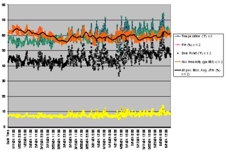 Industry partner Greenstone has been working with BAIHP staff and SGC/E-STAR manufacturers to evaluate a hybrid floor insulation system. These systems, composed of one R-11 belly blanket and R-22 blown cellulose insulation eliminates over-compression and reduces the chance of leakage during transport and set-up, while minimizing material and labor costs. Fleetwood Homes of Washington adopted this system for all of their homes in 2001. Other manufacturers have adopted the hybrid floor insulations system, which provides less insulation voids and reduces first cost of R33 floor system over 3-R11 fiberglass batts. One potential consequence of using the hybrid system is increased moisture in the belly; in 2003, BAIHP staff installed data loggers in two homes to determine whether this is a problem; after the data loggers were retrieved in 2004, BAIHP staff submitted a report to Fleetwood suggesting no dew point problems within the floor system (Figure 20).